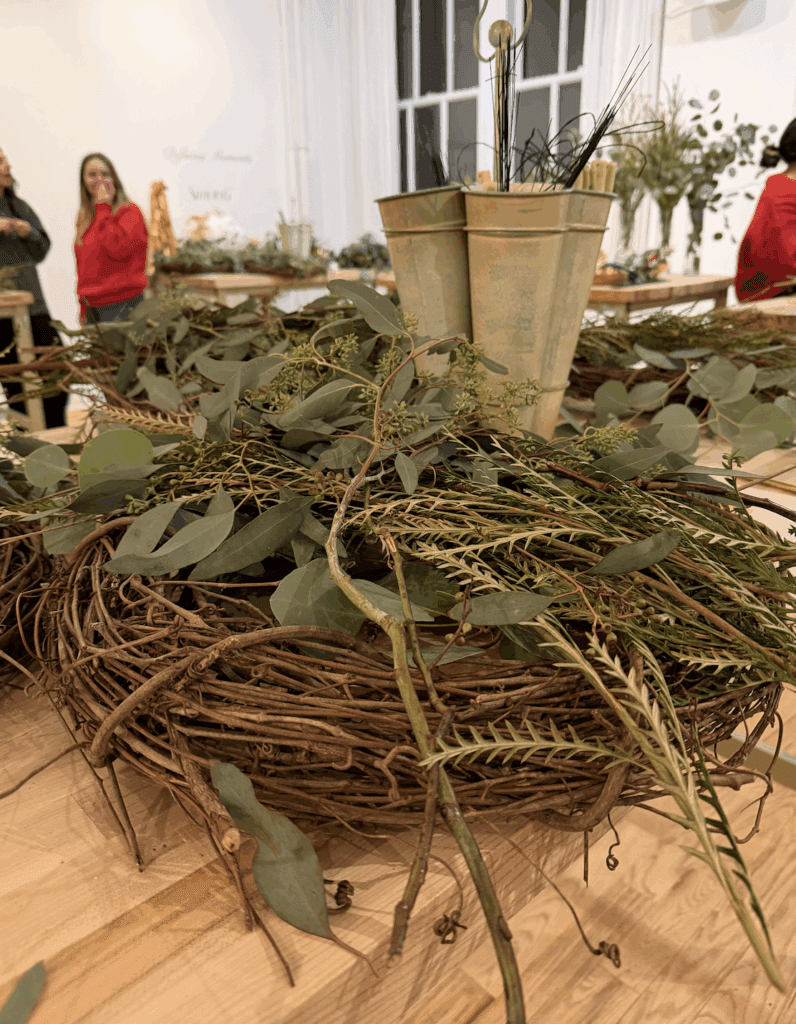 I didn’t take pictures of the actual physical space of the class — and I should have because it was gorgeous. Big, spacious, beautiful, welcoming. Then there were tables set up with all the items that we could use to make our wreath. All the different types of ribbons, ornaments, any kind of greens, etc…It was weaving AND creating at the same time.