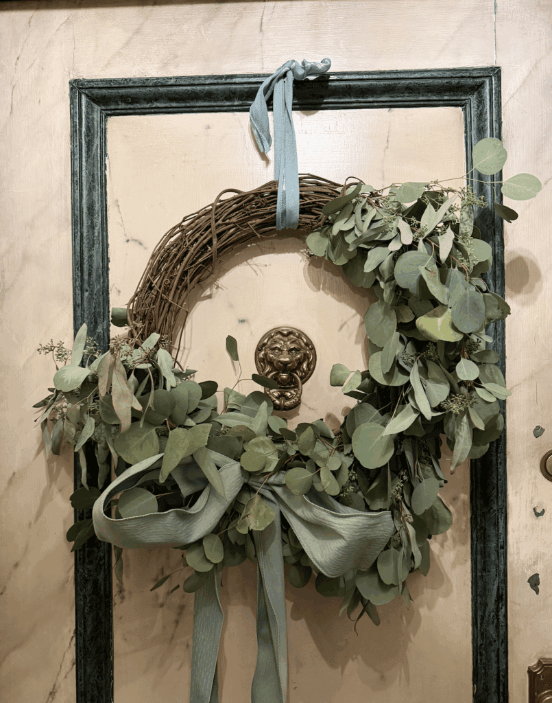 I decided to go very neutral and make a eucalyptus wreath. Holiday but not very much. I loved the way it ended up.