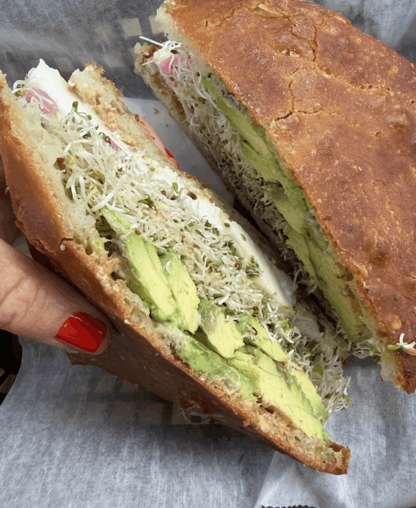 Alfalfa sprouts, avocado mozzarella, and onions. Sooo good. SOOOOO good.